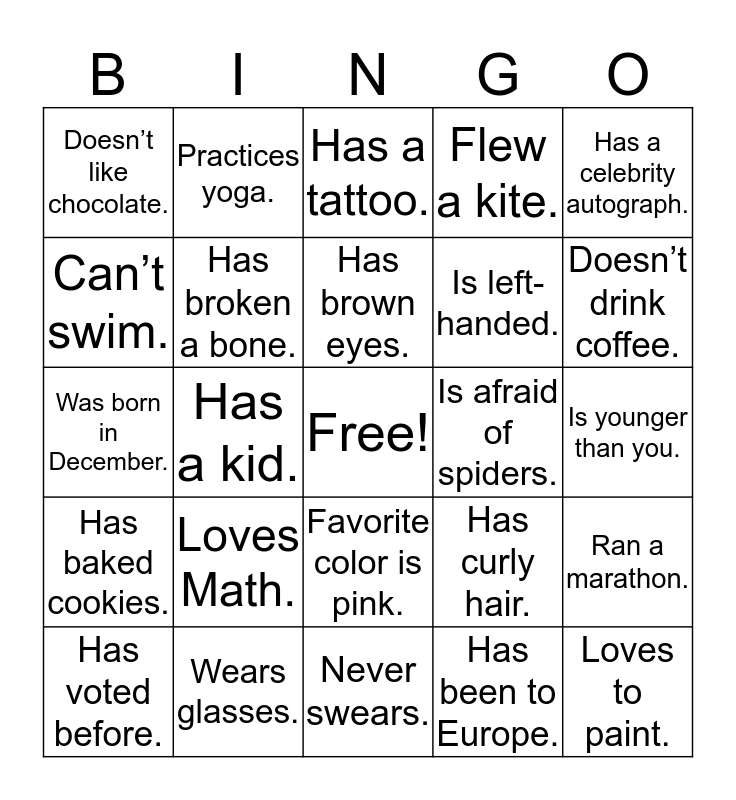 This bingo card has a free space and 24 words: Loves Math., Wears glasses., Has brown eyes., Has voted before., Has a celebrity autograph., Doesn’t like chocolate., Can’t swim., Practices yoga., Is afraid of spiders., Favorite color is pink., Is left-handed., Was born in December., Has curly hair., Ran a marathon., Has broken a bone., Has been to Europe., Is younger than you., Has a tattoo., Doesn’t drink coffee., Has a kid., Loves to paint., Has baked cookies., Flew a kite. and Never swears..
