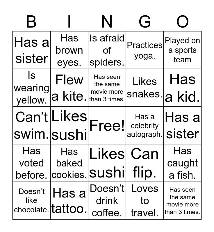 This bingo card has a free space and 28 words: Has caught a fish., Likes cats better than dogs., Likes snakes., Loves to travel., Is wearing yellow., Is afraid of spiders., Has brown eyes., Has voted before., Has a celebrity autograph., Doesn’t like chocolate., Can’t swim., Practices yoga., Has a tattoo., Doesn’t drink coffee., Has a kid., Loves to paint., Has baked cookies., Flew a kite., Has seen the same movie more than 3 times., Likes sushi, Has a sister, Can flip., Has seen the same movie more than 3 times., Likes sushi, Has a sister, Can flip., Played on a sports team and Can do skateboard trick..