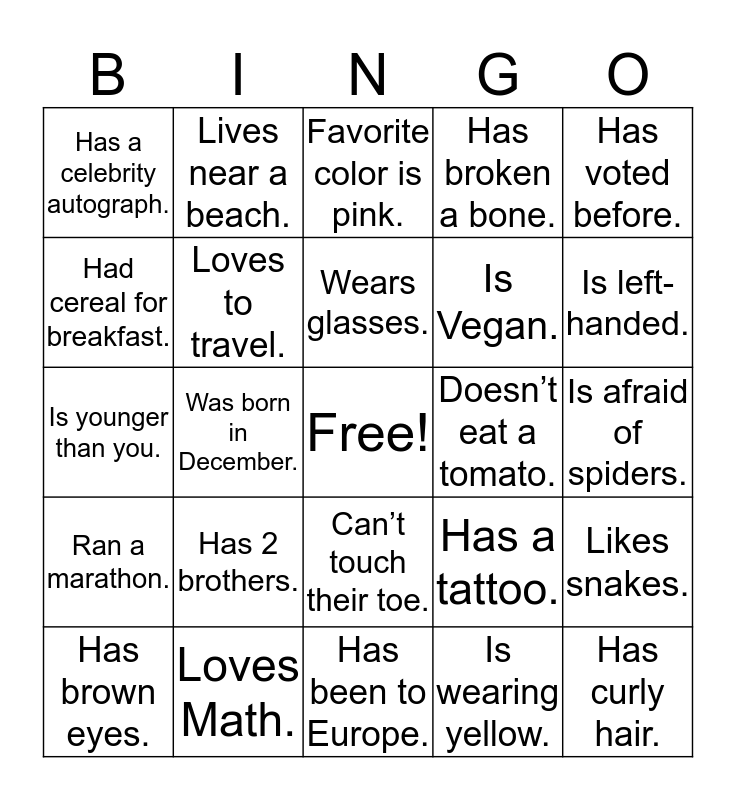 This bingo card has a free space and 24 words: Has 2 brothers., Loves Math., Wears glasses., Has brown eyes., Has voted before., Has a celebrity autograph., Had cereal for breakfast., Lives near a beach., Doesn’t eat a tomato., Can’t touch their toe., Is Vegan., Is younger than you., Has a tattoo., Likes snakes., Loves to travel., Is wearing yellow., Is afraid of spiders., Favorite color is pink., Is left-handed., Was born in December., Has curly hair., Ran a marathon., Has broken a bone. and Has been to Europe..