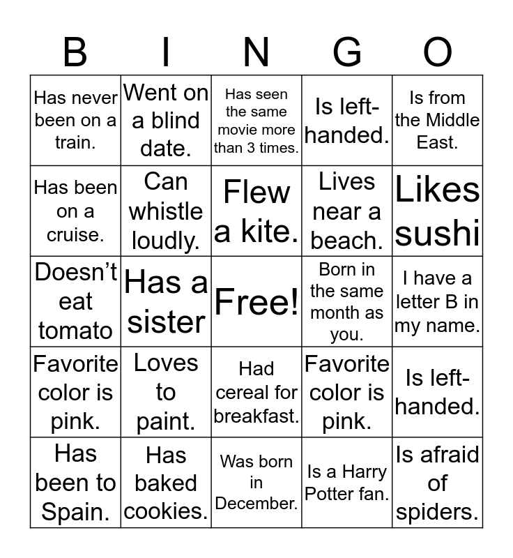 This bingo card has a free space and 24 words: Loves to paint., Has baked cookies., Flew a kite., Has been to Spain., Is from the Middle East., Has never been on a train., Has been on a cruise., Went on a blind date., Born in the same month as you., Had cereal for breakfast., Lives near a beach., Doesn’t eat tomato, Favorite color is pink., Is left-handed., Can whistle loudly., Is a Harry Potter fan., I have a letter B in my name., Has seen the same movie more than 3 times., Likes sushi, Has a sister, Is afraid of spiders., Favorite color is pink., Is left-handed. and Was born in December..