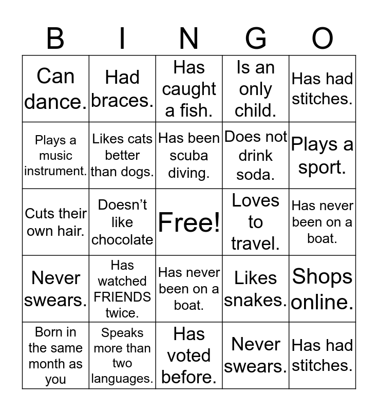 This bingo card has a free space and 31 words: Has voted before., Has a celebrity autograph., Doesn’t like chocolate, Loves to hike., Can dance., Has caught a fish., Likes cats better than dogs., Likes snakes., Loves to travel., Never swears., Has never been on a boat., Has had stitches., Is wearing blue., Enjoys history., Plays a sport., Has taken a selfie this morning., Shops online., Has watched FRIENDS twice., Never swears., Has never been on a boat., Has had stitches., Has made a snowman., Born in the same month as you, Had braces., Does not drink soda., Plays a music instrument., Is an only child., Cuts their own hair., Speaks more than two languages., Has been scuba diving. and Wears contact lens..