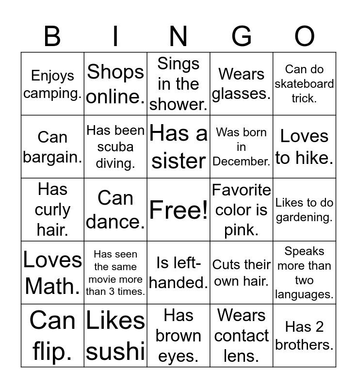 This bingo card has a free space and 24 words: Has seen the same movie more than 3 times., Likes sushi, Has a sister, Can flip., Can do skateboard trick., Enjoys camping., Can bargain., Shops online., Favorite color is pink., Is left-handed., Was born in December., Has curly hair., Cuts their own hair., Speaks more than two languages., Has been scuba diving., Wears contact lens., Likes to do gardening., Sings in the shower., Loves to hike., Can dance., Has 2 brothers., Loves Math., Wears glasses. and Has brown eyes..