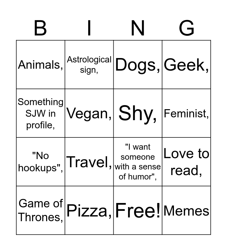 This bingo card has 17 words: Free!, Game of Thrones,, Dogs,, Animals,, Travel,, Geek,, Love to read,, Shy,, Feminist,, Vegan,, Pizza,, "I want someone with a sense of humor",, Something SJW in profile,, Astrological sign,, "No hookups",, Friends, and Memes.