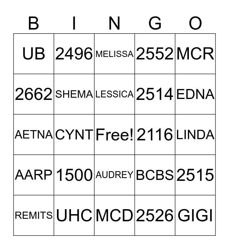This bingo card has a free space and 24 words: 1500, UHC, LESSICA, REMITS, MCR, UB, 2662, 2496, 2116, AUDREY, 2514, AETNA, BCBS, 2515, SHEMA, 2526, LINDA, MELISSA, EDNA, CYNT, GIGI, AARP, 2552 and MCD.