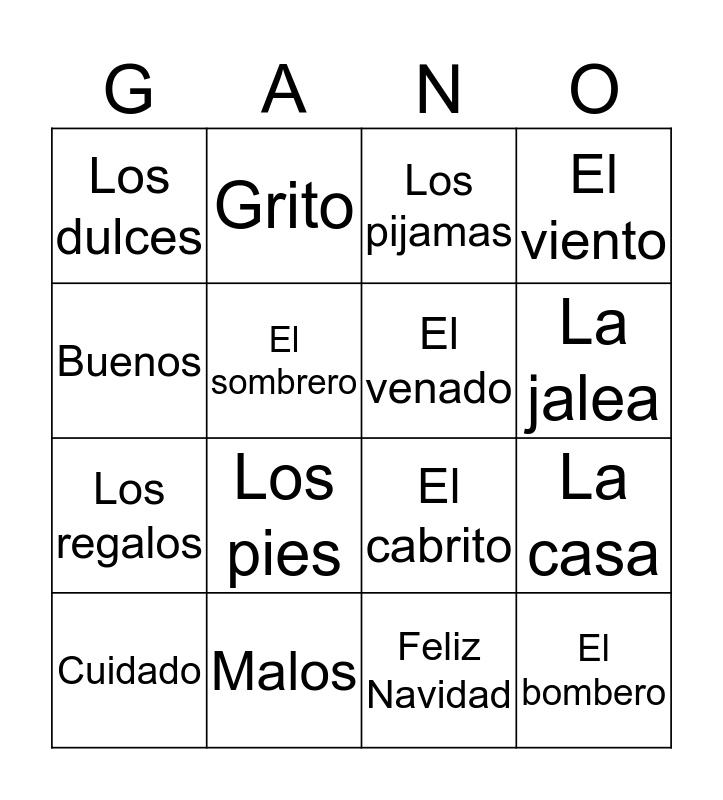 This bingo card has 20 words: La casa, Los niños, Los pijamas, Las medias, Cuidado, Buenos, Malos, Los dulces, Los regalos, Grito, Los pies, El cabrito, El sombrero, El bombero, El venado, El burro, La jalea, El viento, Feliz Navidad and ¿Qué Pasa?.