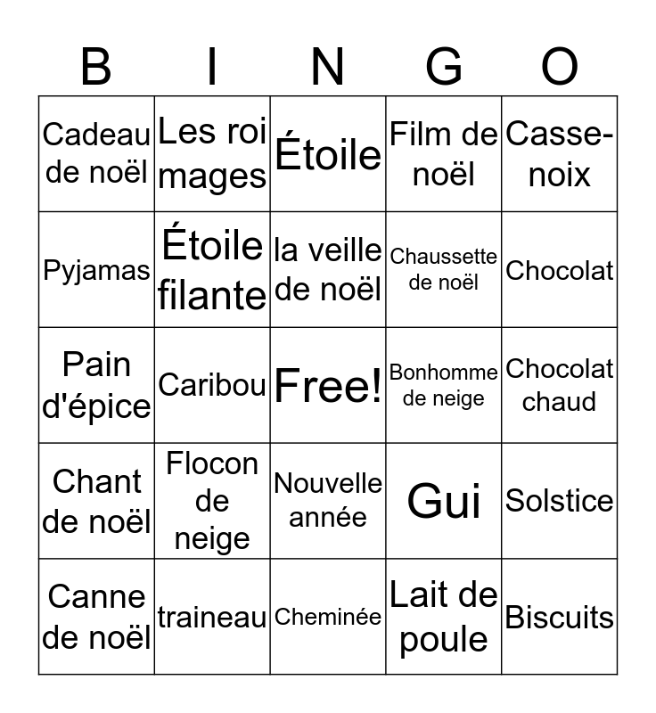 This bingo card has a free space and 29 words: Canne de noël, Père noël, Caribou, Sapin de noël, Cadeau de noël, Étoile, Étoile filante, Flocon de neige, Bonhomme de neige, traineau, Chocolat chaud, Biscuits, Cheminée, Lait de poule, Chocolat, Décembre, Nouvelle année, Chant de noël, Casse-noix, Pain d'épice, Gui, Neige, Chaussette de noël, Pyjamas, Film de noël, Les roi mages, Solstice, la veille de noël and Noël.
