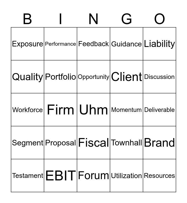 This bingo card has a free space and 32 words: Utilization, Availability, Firm, Optimization, Segment, Portfolio, Liability, Brand, Performance, Profitability, Opportunity, Feedback, Incentive, Value, Momentum, Calibrate, Testament, Workforce, Fiscal, Proposal, Townhall, Practices, Deliverable, EBIT, Resources, Guidance, Client, Quality, Exposure, Forum, CAL and Discussion.