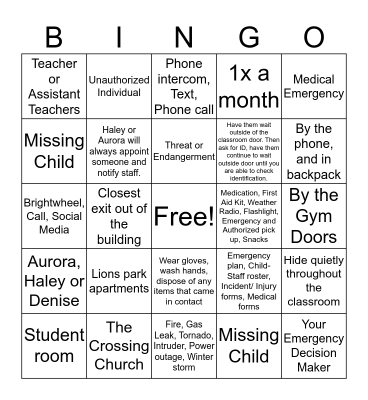 This bingo card has a free space and 27 words: Evacuation, Shelter in place and lock down procedures, The Crossing Church, Threat or Endangerment, Missing Child, Medical Emergency, Missing Child, Unauthorized Individual, Fire, Gas Leak, Tornado, Intruder, Power outage, Winter storm, Medication, First Aid Kit, Weather Radio, Flashlight, Emergency and Authorized pick up, Snacks, Hide quietly throughout the classroom, Aurora, Haley or Denise, Haley or Aurora will always appoint someone and notify staff., Emergency plan, Child- Staff roster, Incident/ Injury forms, Medical forms, Your Emergency Decision Maker, Brightwheel, Call, Social Media, What has happened, If all children are accounted for, when it is safe to pick up, pick up location, reunification requirements, Phone intercom, Text, Phone call, 1x a month, By the Gym Doors, Teacher or Assistant Teachers, Lions park apartments, Wear gloves, wash hands, dispose of any items that came in contact, Have them wait outside of the classroom door. Then ask for ID, have them continue to wait outside door until you are able to check identification., By the phone, and in backpack, Student room, Closest exit out of the building and There are evacuation cribs, they load the children into.