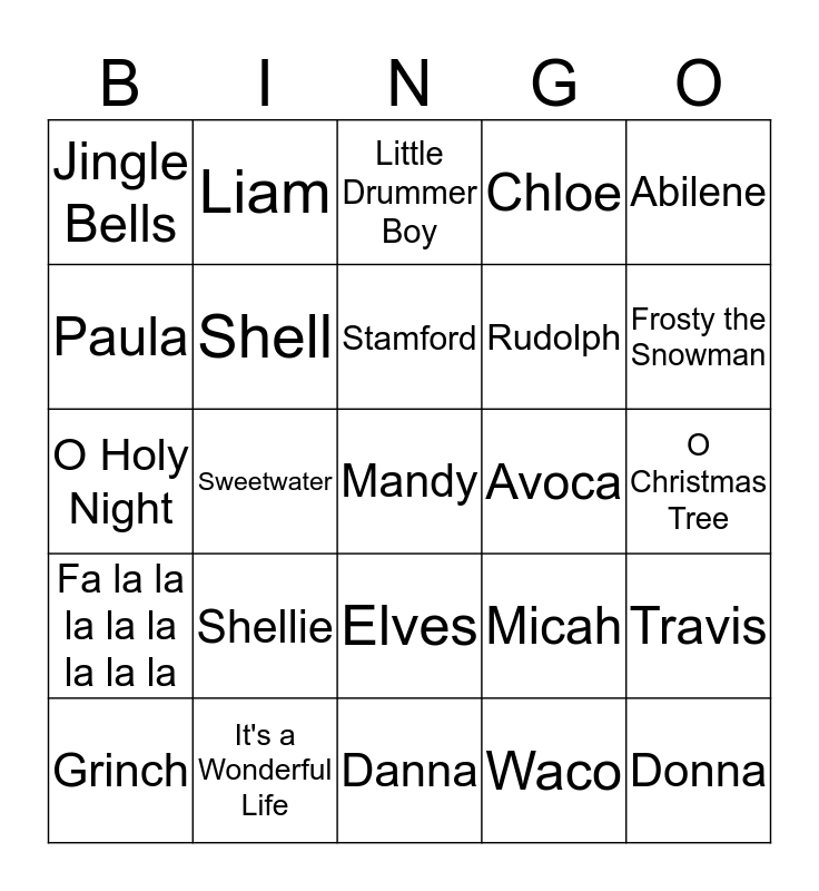 This bingo card has a free space and 49 words: Danny, Donna, Davin, Danna, Shellie, Nathan, Liam, Mike, Paula, Shane, Shell, Chloe, Travis, Micah, Kirk, Kelton, Stamford, Avoca, Fairfield, Abilene, Sweetwater, Waco, Jingle Bells, Rudolph, Home Alone, Frosty the Snowman, Grinch, Santa Claus, Elves, Fa la la la la la la la la, Silent Night, First Noel, Prancer, Miracle on 34th Street, It's a Wonderful Life, A Christmas Story, Charlie Brown, Chicken & Dressing, O Christmas Tree, Sleigh Ride, White Christmas, Jingle Bell Rock, Savior, Bethlehem, O Holy Night, Little Drummer Boy, Mary & Joseph, Manger and Angel.