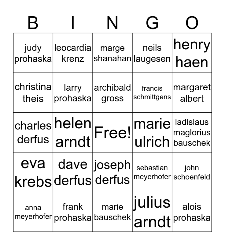 This bingo card has a free space and 29 words: anna meyerhofer, henry derfus, helen arndt, bill prohaska, judy prohaska, marge shanahan, larry prohaska, dave derfus, marie ulrich, frank prohaska, ladislaus maglorius bauschek, alois prohaska, marie bauschek, julius arndt, margaret albert, ignatz ulrich, joseph derfus, eva krebs, henry haen, charles derfus, sebastian meyerhofer, rosina marchebauer, francis schmittgens, christina theis, neils laugesen, leocardia krenz, john schoenfeld, archibald gross and elaine weiler.