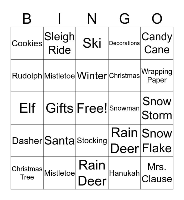 This bingo card has a free space and 24 words: Santa, Mistletoe, Winter, Christmas Tree, Candy Cane, Cookies, Rudolph, Sleigh Ride, Snowman, Stocking, Christmas, Elf, Rain Deer, Snow Flake, Mistletoe, Hanukah, Snow Storm, Ski, Wrapping Paper, Gifts, Mrs. Clause, Dasher, Decorations and Rain Deer.