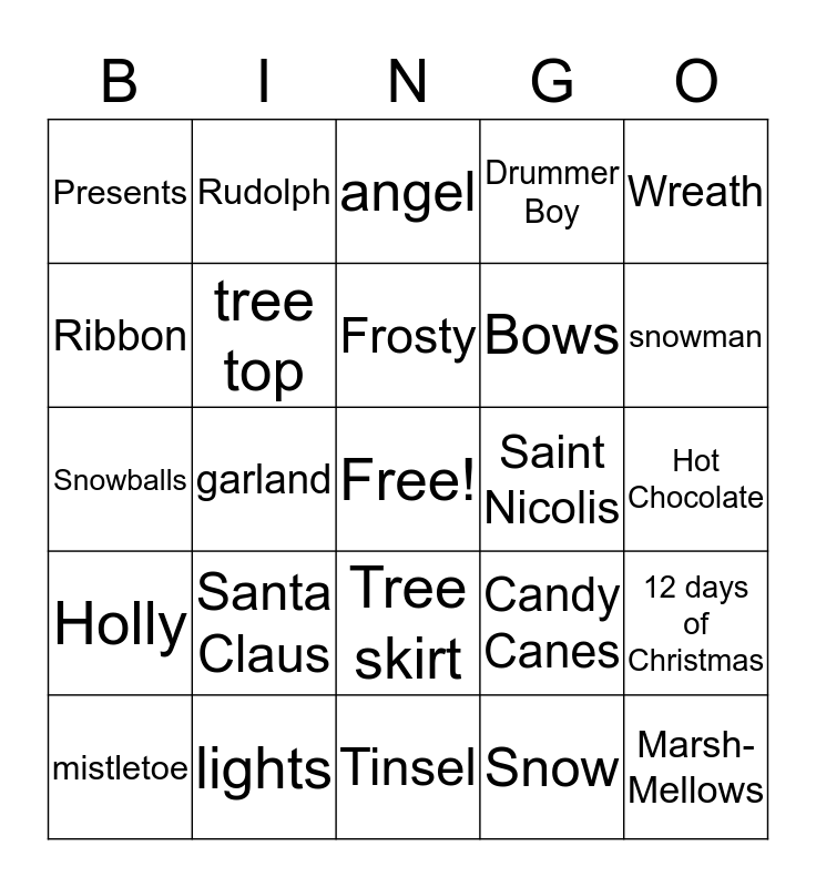 This bingo card has a free space and 29 words: mistletoe, tree, garland, ornaments, Presents, angel, tree top, Santa Claus, Saint Nicolis, lights, Hot Chocolate, Marsh- Mellows, Tinsel, Snow, snowman, Bells, Tree skirt, Holly, Wreath, Snowballs, Candy Canes, Snow flake, Bows, Ribbon, Drummer Boy, Rudolph, 12 days of Christmas, Frosty and Red nose.