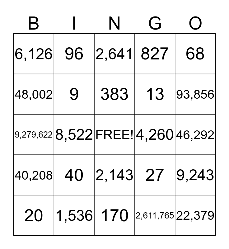 This bingo card has a free space and 24 words: 40, 1,536, 383, 20, 68, 6,126, 48,002, 96, 4,260, 2,143, 13, 9,279,622, 27, 9,243, 9, 2,611,765, 46,292, 2,641, 93,856, 8,522, 22,379, 40,208, 827 and 170.