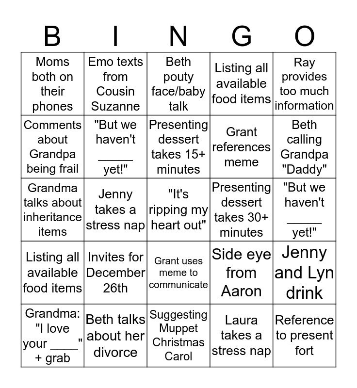 This bingo card has 51 words: Aaron says "grandma saying 'i love your ____' and then touching or grabbing that clothing item", "It's ripping my heart out", "But we've always done it this way", Suggesting Muppet Christmas Carol, Invites for December 26th, Beth talks about her divorce, Emo texts from Cousin Suzanne, "You'll probably hate it", Comments about Grandpa being frail, Grandpa falls asleep in his chair, "But we haven't _____ yet!", Listing all available food items, Jenny and Lyn drink, Side eye from Aaron, Grandma hugs for too long, Christmas wreath plays for ghosts, Presenting dessert takes 15+ minutes, Presenting dessert takes 30+ minutes, Grandma talks about inheritance items, Ray provides too much information, Jenny takes a stress nap, Laura takes a stress nap, Moms both on their phones, Grant references meme, Grandma asking if everyone has a drink, Reference to present fort, Beth calling Grandpa "Daddy", Grandma forcing posed photos, Grandma: "I love your ____" + grab, Beth pouty face/baby talk, Laura commenting on Lyn's morals, "It's ripping my heart out", "But we've always done it this way", Suggesting Muppet Christmas Carol, Invites for December 26th, Beth talks about her divorce, Emo texts from Cousin Suzanne, "You'll probably hate it", Comments about Grandpa being frail, Grandpa falls asleep in his chair, "But we haven't _____ yet!", Listing all available food items, Grandma hugs for too long, Christmas wreath plays randomly, Presenting dessert takes 15+ minutes, Presenting dessert takes 30+ minutes, Grandma talks about inheritance items, Laura takes a stress nap, Literally everyone on their phones, Grant uses meme to communicate and Rob is much later than expected.