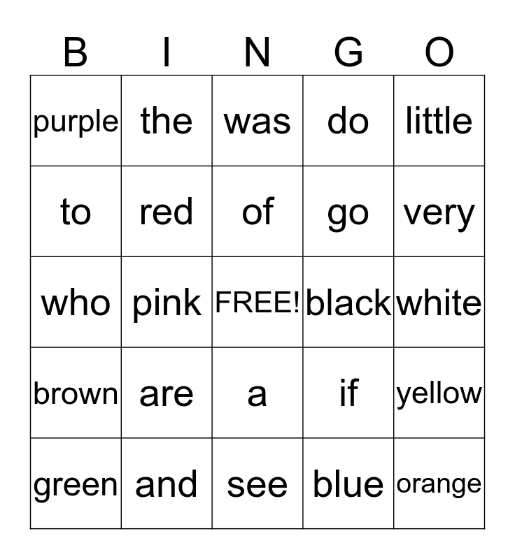 This bingo card has a free space and 24 words: are, and, of, green, little, purple, to, the, black, a, go, who, if, yellow, red, blue, white, was, very, pink, orange, brown, do and see.