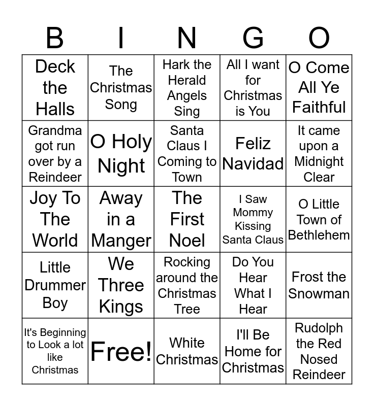 This bingo card has 30 words: Free!, Silver Bells, Away in a Manger, All I want for Christ is My Two Front Teeth, Deck the Halls, Hark the Herald Angels Sing, O Holy Night, Rocking around the Christmas Tree, I Saw Mommy Kissing Santa Claus, White Christmas, O Little Town of Bethlehem, The First Noel, I'll Be Home for Christmas, Rudolph the Red Nosed Reindeer, It came upon a Midnight Clear, What Child is This, Do You Hear What I Hear, Little Drummer Boy, We Three Kings, O Come All Ye Faithful, Joy To The World, Angels We Have Heard on High, The Christmas Song, Feliz Navidad, Grandma got run over by a Reindeer, All I want for Christmas is You, Frost the Snowman, It's Beginning to Look a lot like Christmas, Santa Claus I Coming to Town and We Wish you a Merry Christmas.