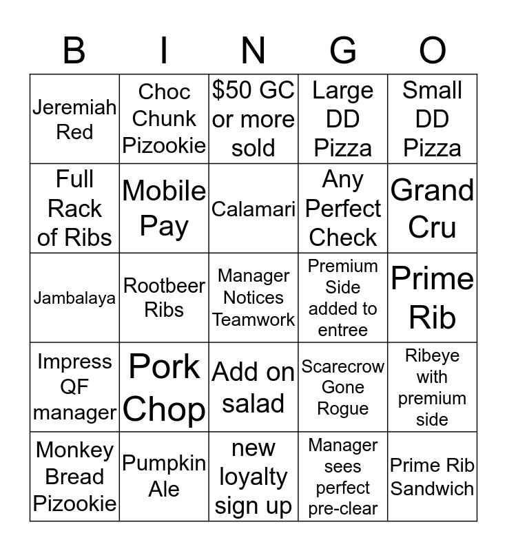 This bingo card has a free space and 24 words: Pork Chop, Pumpkin Ale, Calamari, Monkey Bread Pizookie, Small DD Pizza, Jeremiah Red, Full Rack of Ribs, Choc Chunk Pizookie, Premium Side added to entree, Add on salad, Any Perfect Check, Jambalaya, Scarecrow Gone Rogue, Ribeye with premium side, Mobile Pay, Manager sees perfect pre-clear, Prime Rib, $50 GC or more sold, Grand Cru, Rootbeer Ribs, Prime Rib Sandwich, Impress QF manager, Large DD Pizza and new loyalty sign up.