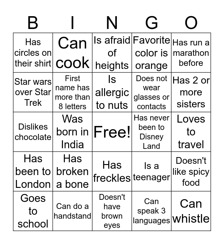 This bingo card has a free space and 34 words: Is an only child, Can speak 3 languages, Hates onions, Is afraid of spiders, Has been to London, First name has more than 8 letters, Has run a marathon before, Goes to school, Can cook, Samsung over Apple, Is allergic to nuts, Is afraid of heights, Doesn't drink coffee, Is wearing the color yellow, Has never been to Disney Land, Has 2 or more sisters, Can do a handstand, Dislikes chocolate, Has broken a bone, Is a teenager, Has freckles, Has a dog, Has circles on their shirt, Loves to travel, Doesn't have brown eyes, Can whistle, Favorite color is orange, Has a tattoo, Does not wear glasses or contacts, Star wars over Star Trek, Likes marvel more than DC, Was born in India, Doesn't like spicy food and Can touch their nose with their tongue.