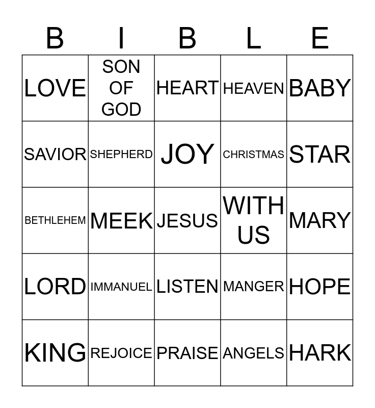 This bingo card has a free space and 24 words: IMMANUEL, REJOICE, JOY, KING, BABY, LOVE, SAVIOR, SON OF GOD, WITH US, LISTEN, CHRISTMAS, BETHLEHEM, MANGER, HOPE, SHEPHERD, ANGELS, MARY, HEART, STAR, MEEK, HARK, LORD, HEAVEN and PRAISE.
