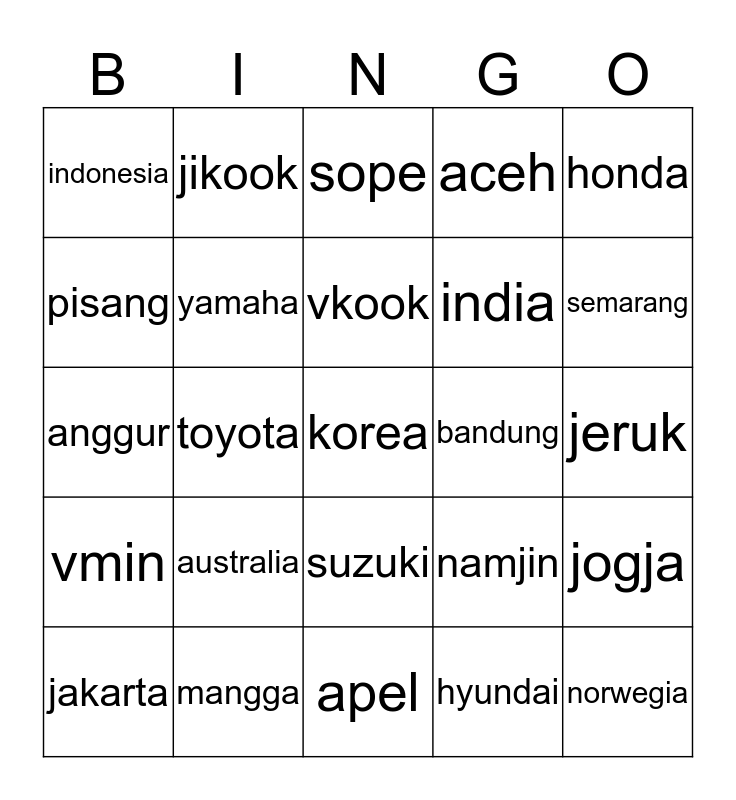 This bingo card has 25 words: australia, apel, vkook, jakarta, honda, indonesia, pisang, jikook, bandung, suzuki, india, anggur, namjin, jogja, yamaha, norwegia, jeruk, sope, semarang, toyota, korea, mangga, vmin, aceh and hyundai.