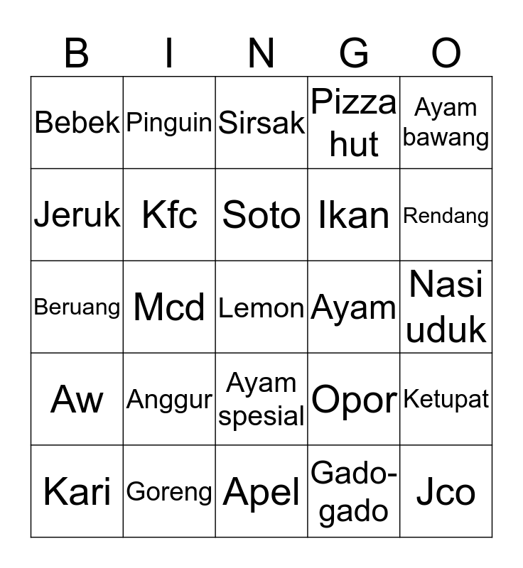 This bingo card has a free space and 24 words: Anggur, Goreng, Soto, Kari, Ayam bawang, Bebek, Jeruk, Pinguin, Ayam, Ayam spesial, Ikan, Beruang, Opor, Ketupat, Kfc, Gado-gado, Nasi uduk, Sirsak, Rendang, Mcd, Jco, Aw, Pizza hut and Apel.