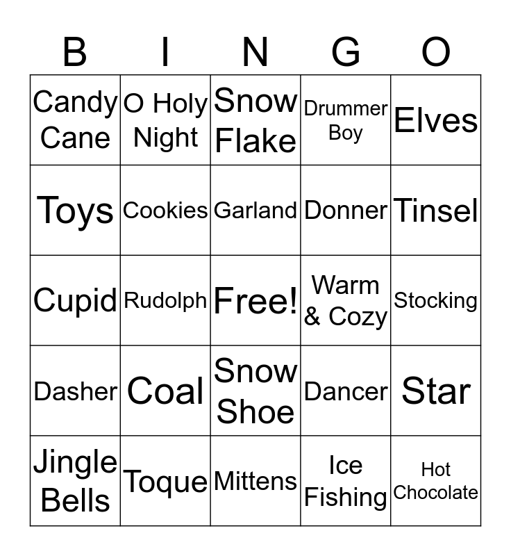 This bingo card has a free space and 29 words: Jingle Bells, Santa Claus, Rudolph, Silent Night, Candy Cane, Snow Flake, Cookies, Coal, Warm & Cozy, Toque, Stocking, Hot Chocolate, Mittens, Ice Fishing, Tinsel, Blitzen, Snow Shoe, Dasher, Elves, Cupid, Dancer, Comet, Donner, Toys, Drummer Boy, O Holy Night, Star, Garland and Sled.