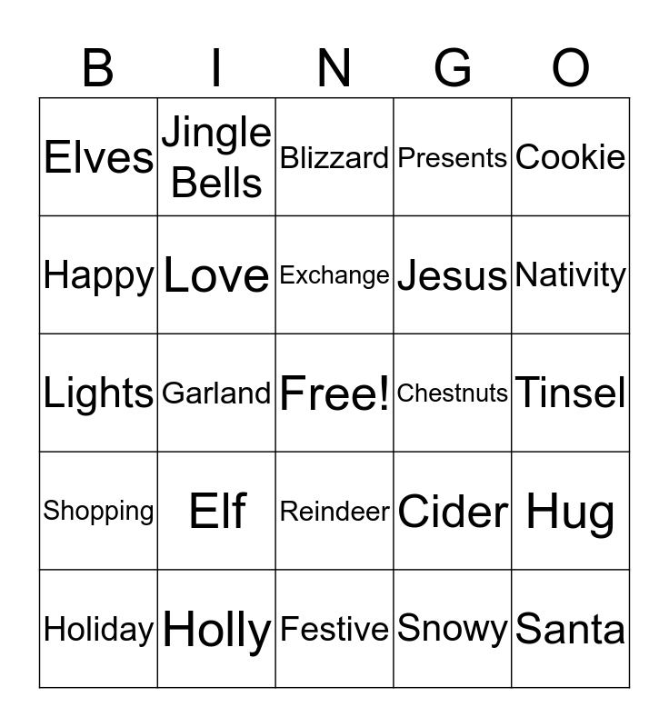 This bingo card has a free space and 83 words: 25, Angel, Blizzard, Candle, Candy, Bells, Bow, Box, Celebrate, Christmas, Family, Feast, Festive, Cider, Decorate, Elves, Elf, Exchange, Firewood, Frosty, Fireplace, Garland, Caroling, Cold, Cookie, Gingerbread, Greetings, Gift, Give, Green, Happy, Hope, Chimney, Chestnuts, Hug, Holiday, Holly, Icicle, Jesus, Nativity, Naughty, Nice, Star, Snowflake, Snowball, Noel, Jingle Bells, Jack Frost, Candy Cane, Kings, Lights, Love, Manger, Merry, Mistletoe, Joy, Jolly, Joyful, Mittens, North Pole, Nutcracker, Ornaments, Party, Presents, Scrooge, Shopping, Skate, Pie, Rudolph, Tree, Unwrap, Winter, Stocking, Snowy, Tinsel, Tradition, Wrapping Paper, Reindeer, Ribbon, Santa, Saint Nicholas, Sleigh Bells and Snowman.