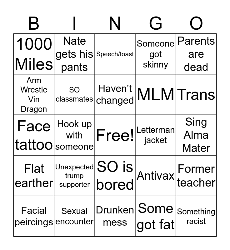 This bingo card has a free space and 24 words: Unexpected trump supporter, Sexual encounter, Haven’t changed, Facial peircings, Parents are dead, 1000 Miles, Arm Wrestle Vin Dragon, Nate gets his pants, Letterman jacket, SO is bored, MLM, Face tattoo, Antivax, Former teacher, SO classmates, Some got fat, Sing Alma Mater, Speech/toast, Trans, Hook up with someone, Something racist, Flat earther, Someone got skinny and Drunken mess.