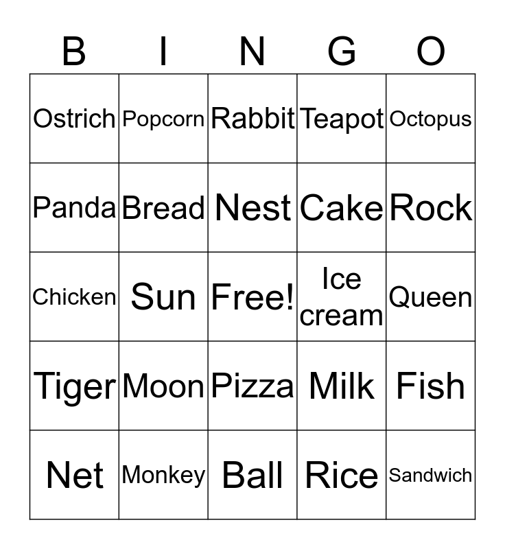 This bingo card has a free space and 24 words: Moon, Monkey, Nest, Net, Octopus, Ostrich, Panda, Popcorn, Ice cream, Pizza, Cake, Chicken, Milk, Fish, Bread, Rice, Queen, Rabbit, Rock, Sun, Sandwich, Tiger, Teapot and Ball.