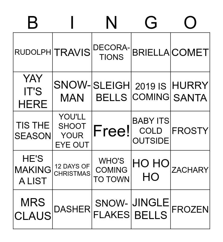 This bingo card has a free space and 29 words: MRS CLAUS, BETTER BE GOOD, YOU'LL SHOOT YOUR EYE OUT, CHRIST-MAS STORY, RUDOLPH, DECORA-TIONS, SNOW-MAN, 12 DAYS OF CHRISTMAS, BABY ITS COLD OUTSIDE, DASHER, FROSTY, FROZEN, SNOW-FLAKES, JINGLE BELLS, HURRY SANTA, DECK THE HALLS, WHO'S COMING TO TOWN, HE'S MAKING A LIST, COMET, TIS THE SEASON, HO HO HO, BETHLE-HEM, 2019 IS COMING, YAY IT'S HERE, BRIELLA, TRAVIS, ZACHARY, SLEIGH BELLS and OPEN PRES-ENTS.
