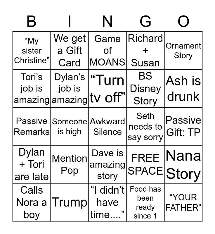 This bingo card has 25 words: Mention Pop, “I didn’t have time....”, “Turn tv off”, Calls Nora a boy, Ornament Story, “My sister Christine”, Tori’s job is amazing, We get a Gift Card, Seth needs to say sorry, Dave is amazing story, BS Disney Story, Passive Remarks, FREE SPACE, Nana Story, Dylan’s job is amazing, “YOUR FATHER”, Passive Gift: TP, Game of MOANS, Ash is drunk, Someone is high, Awkward Silence, Trump, Dylan + Tori are late, Richard + Susan and Food has been ready since 1.