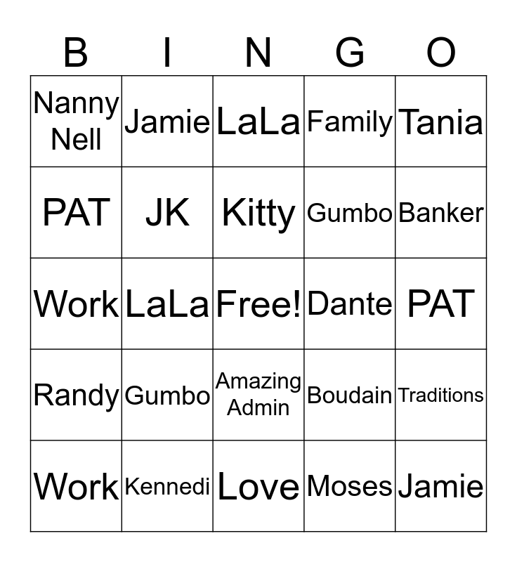 This bingo card has a free space and 60 words: Love, Kennedi, Vodka, Randy, Moses, Joy, JK, Cassie, Gumbo, Boudain, Family, Jackie, PAT, Fresno, Joshua, Nanny Nell, Jamie, Tania, Oxtails, Kitty, Dante, LaLa, Work, Traditions, Nurse, Engineer, Trainer, Plant Life, Banker, Moses, Jackie, PAT, Nanny Nell, Kitty, Jamie, Dante, Tania, LaLa, Oxtails, Work, Joy, Gumbo, PAT, JK, Boudain, Fresno, Cassie, Family, Joshua, Amazing Admin, Love, Nurse, Engineer, Trainer, Plant Life, Banker, Kennedi, Vodka, Randy and Traditions.