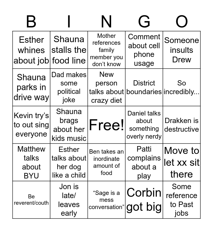 This bingo card has a free space and 29 words: Be reverent/couth, Kevin talks down to someone, Shauna brags about her kids music, Kids in order, Esther whines about job, Mother references family member you don’t know, Dad makes some political joke, Esther talks about her dog like a child, Daniel talks about something overly nerdy, Jon is late/ leaves early, Drakken is destructive, Some reference to Past jobs, “Sage is a mess conversation”, Corbin got big, So incredibly..., Malia told to finish meal, Ben takes an inordinate amount of food, Matthew talks about BYU, Someone insults Drew, Kevin try’s to out sing everyone, Patti complains about a play, Someone talks about Dehaan, District boundaries, Shauna parks in drive way, Comment about cell phone usage, Shauna stalls the food line, Move to let xx sit there, New person talks about crazy diet and Corbin driving comment.