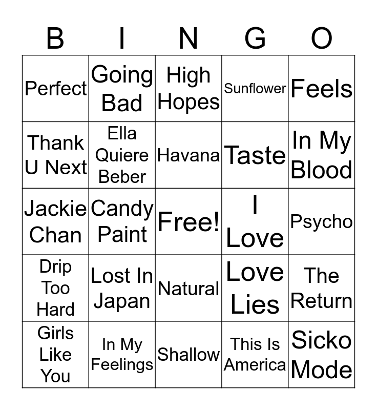This bingo card has a free space and 33 words: Better, Better Now, Candy Paint, Consequences, Drip Too Hard, Ella Quiere Beber, Feels, Girls Like You, Going Bad, Happier, Havana, High Hopes, I Am The Grinch, I Like It, I Love, In My Blood, In My Feelings, Jackie Chan, Lost In Japan, Love Lies, Natural, Nice For What, Perfect, Psycho, Shallow, Sicko Mode, Sunflower, Taste, Thank U Next, The Return, This Feeling, This Is America and Without Me.