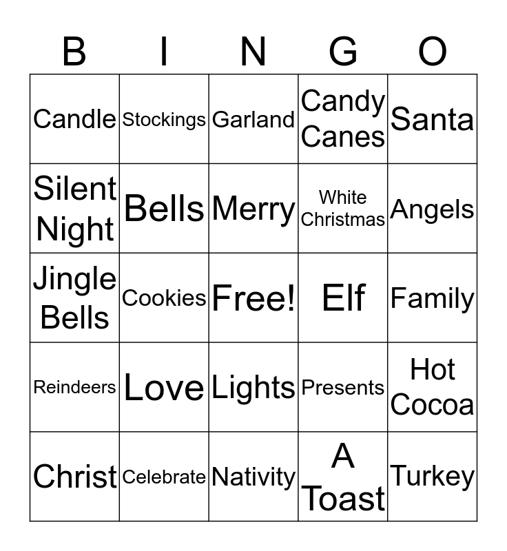 This bingo card has a free space and 39 words: Ornament, Wreath, Joy, Bells, Christ, Lights, Merry, Pine Tree, Santa, Reindeers, Cookies, Candy Canes, Turkey, Family, Elf, Love, Star, Candle, Yule Log, Presents, Silent Night, Nativity, White Christmas, Angels, Ribbons, Bows, Music, Poinsettia, Charlie Brown, Stockings, Caroling, Snow, Garland, Celebrate, A Toast, Sparkling Cider, Hot Cocoa, Jingle Bells and Fudge.