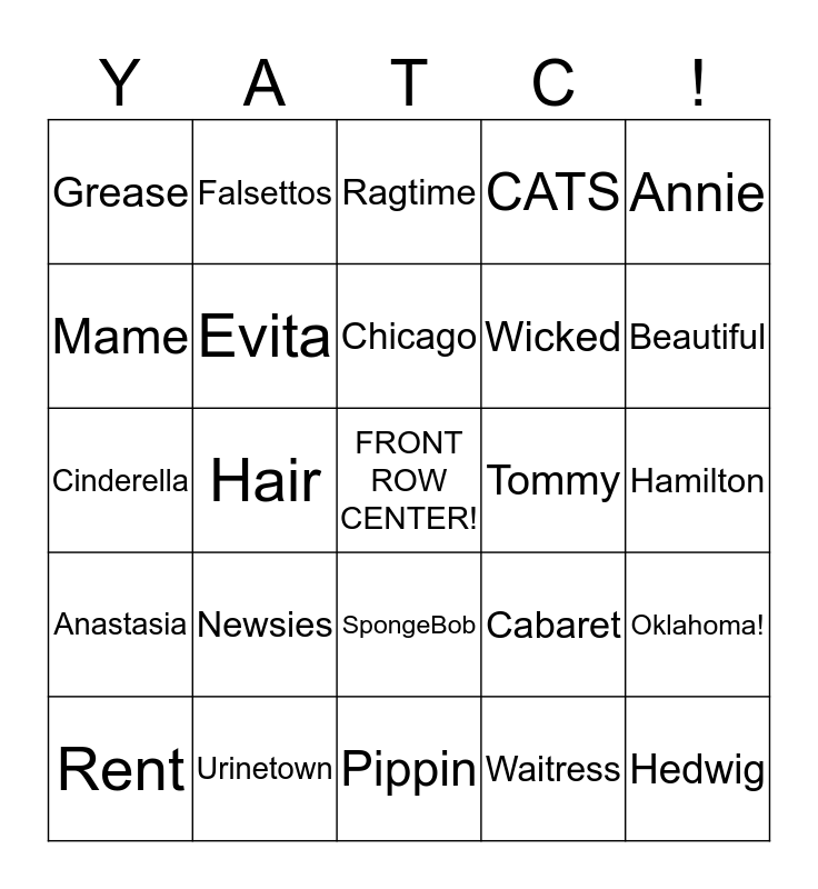 This bingo card has a free space and 29 words: Rent, Frozen, Hair, Hairspray, Grease, Ragtime, Evita, Newsies, Tommy, Urinetown, Hamilton, Hedwig, Pippin, Waitress, Beautiful, Dreamgirls, SpongeBob, Anastasia, Annie, Cinderella, Cabaret, Aladdin, Wicked, Mame, CATS, Falsettos, Oklahoma!, Chicago and Gypsy.