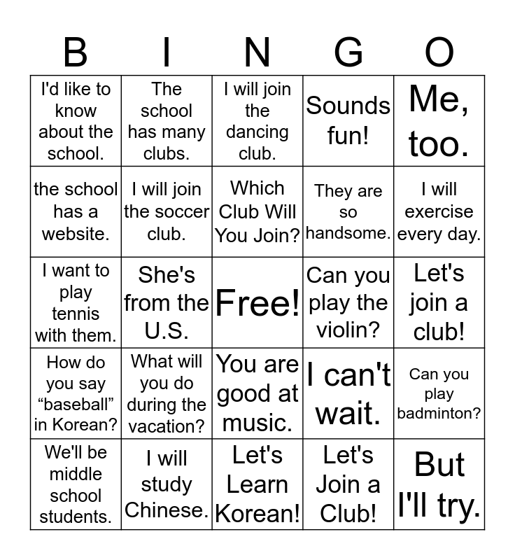 This bingo card has a free space and 24 words: What will you do during the vacation?, I will study Chinese., Which Club Will You Join?, We'll be middle school students., Me, too., I'd like to know about the school., the school has a website., The school has many clubs., Can you play the violin?, You are good at music., They are so handsome., I want to play tennis with them., I can't wait., Can you play badminton?, I will join the soccer club., Let's Join a Club!, Let's join a club!, I will join the dancing club., I will exercise every day., She's from the U.S., But I'll try., How do you say “baseball” in Korean?, Sounds fun! and Let's Learn Korean!.