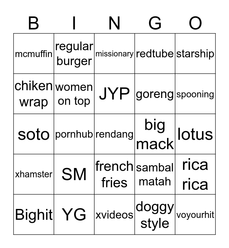 This bingo card has a free space and 24 words: SM, YG, JYP, Bighit, starship, mcmuffin, chiken wrap, regular burger, big mack, french fries, goreng, soto, sambal matah, rica rica, women on top, doggy style, lotus, missionary, spooning, pornhub, voyourhit, xhamster, redtube and xvideos.