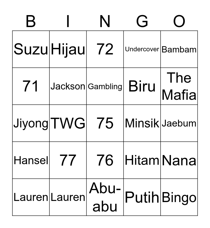 This bingo card has a free space and 24 words: 77, Lauren, Gambling, Lauren, Bambam, Suzu, 71, Hijau, Minsik, 76, Biru, Jiyong, Hitam, Nana, Jackson, Putih, Jaebum, 72, The Mafia, TWG, Bingo, Hansel, Undercover and Abu-abu.