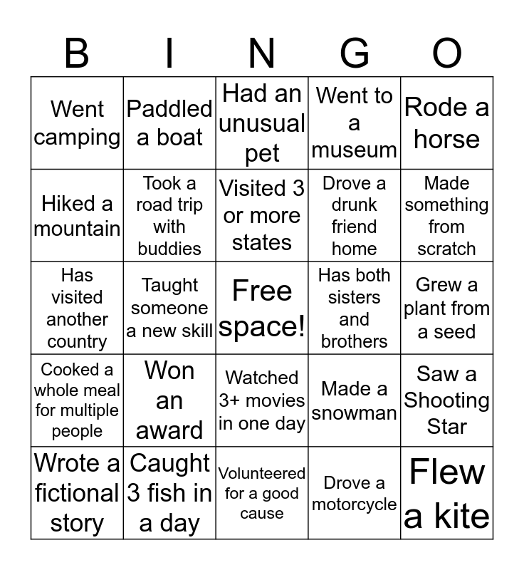 This bingo card has a free space and 24 words: Won an award, Caught 3 fish in a day, Visited 3 or more states, Wrote a fictional story, Rode a horse, Went camping, Hiked a mountain, Paddled a boat, Has both sisters and brothers, Watched 3+ movies in one day, Drove a drunk friend home, Has visited another country, Made a snowman, Saw a Shooting Star, Took a road trip with buddies, Drove a motorcycle, Grew a plant from a seed, Had an unusual pet, Made something from scratch, Taught someone a new skill, Flew a kite, Cooked a whole meal for multiple people, Went to a museum and Volunteered for a good cause.