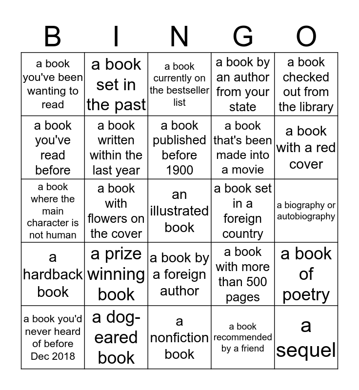 This bingo card has 25 words: a prize winning book, a nonfiction book, a book published before 1900, a book you'd never heard of before Dec 2018, a book checked out from the library, a book you've been wanting to read, a book you've read before, a book set in the past, a book set in a foreign country, a book by a foreign author, a book that's been made into a movie, a book where the main character is not human, a book with more than 500 pages, a book of poetry, a book written within the last year, a sequel, a biography or autobiography, a book currently on the bestseller list, a book with a red cover, a book with flowers on the cover, an illustrated book, a dog-eared book, a hardback book, a book by an author from your state and a book recommended by a friend.