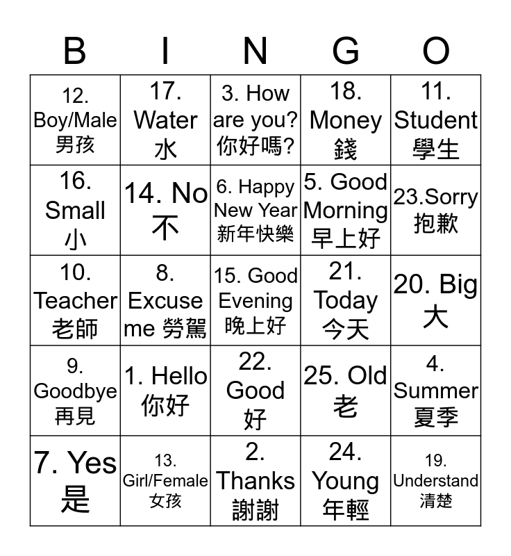 This bingo card has 25 words: 1. Hello 你好, 2. Thanks 謝謝, 6. Happy New Year 新年快樂, 7. Yes 是, 11. Student 學生, 12. Boy/Male 男孩, 16. Small 小, 17. Water 水, 21. Today 今天, 22. Good 好, 5. Good Morning 早上好, 10. Teacher 老師, 25. Old 老, 4. Summer 夏季, 14. No 不, 19. Understand清楚, 20. Big 大, 3. How are you? 你好嗎?, 23.Sorry 抱歉, 8. Excuse me 勞駕, 15. Good Evening 晚上好, 13. Girl/Female女孩, 9. Goodbye 再見, 18. Money 錢 and 24. Young 年輕.