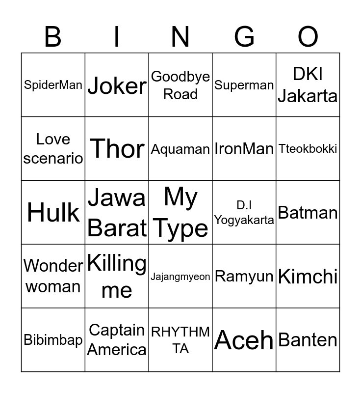 This bingo card has a free space and 24 words: Killing me, Captain America, Aquaman, Bibimbap, DKI Jakarta, SpiderMan, Love scenario, Joker, D.I Yogyakarta, Jajangmyeon, IronMan, Hulk, Ramyun, Kimchi, Thor, Aceh, Batman, Goodbye Road, Tteokbokki, Jawa Barat, Banten, Wonder woman, Superman and RHYTHM TA.