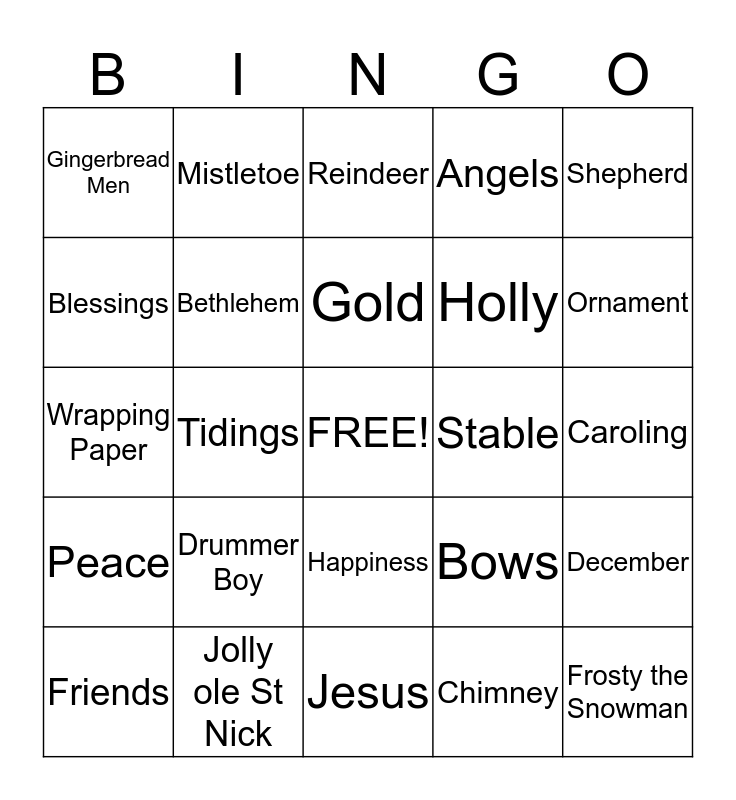 This bingo card has a free space and 71 words: Stockings, Mistletoe, Chestnuts, Santa Clause, Jesus, Wise Men, Angels, Manger, Holly, Family, Friends, Parties, Ornament, Gingerbread Men, Candy, Wrapping Paper, Bows, Shepherd, Poinsettias, Caroling, Drummer Boy, Frosty the Snowman, December, Christmas, Jingle Bells, Shopping, Rudolph, Yuletide, Noel, Joy To The World, Jolly ole St Nick, Eggnog, Turkey, Cranberries, Chimney, Joseph and Mary, Christmas @ Oasis, Love, Blessings, Thankfulness, Happiness, Giving, Peace, Immanuel, Savior, Star, Nativity, Bethlehem, frankincense, Birth, Holidays, Messiah, Stable, Lights, Toys, Myrrh, Gold, Snow, Celebrate, Sled, Merry Christmas, Red and Green, Tidings, Bows, Fireplace, Fruitcake, Reindeer, North Pole, Roof Tops, Candy Canes and Cookies.