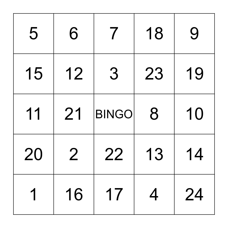 This bingo card has a free space and 24 words: 1, 2, 3, 4, 9, 5, 6, 7, 8, 10, 11, 12, 13, 14, 15, 16, 17, 18, 19, 20, 21, 22, 23 and 24.