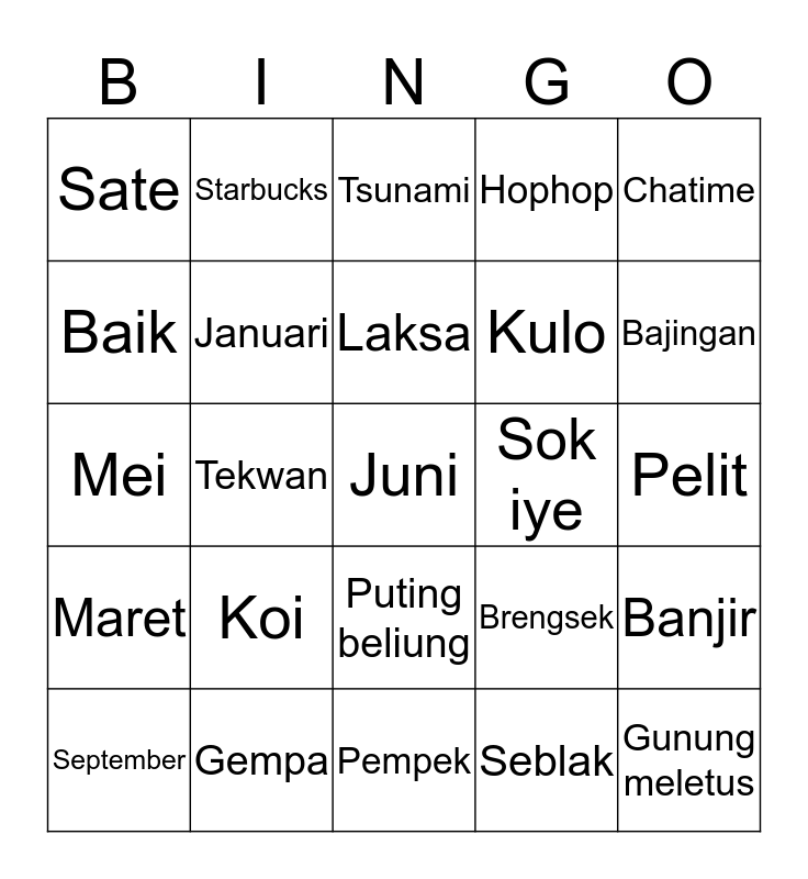 This bingo card has 25 words: Koi, Pempek, Laksa, September, Chatime, Sate, Baik, Starbucks, Sok iye, Puting beliung, Kulo, Mei, Brengsek, Banjir, Januari, Gunung meletus, Pelit, Tsunami, Bajingan, Tekwan, Juni, Gempa, Maret, Hophop and Seblak.
