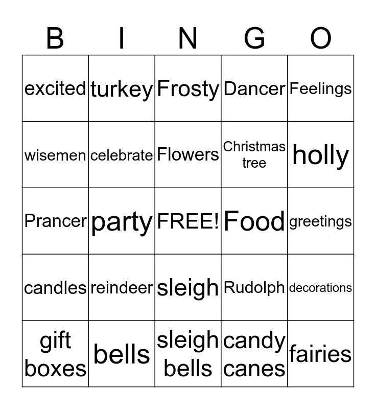 This bingo card has a free space and 58 words: angels, bells, Blitzer, candles, candy canes, cards, celebrate, chimney, Christmas tree, Cupid, Dancer, Dasher, donkey, Donner, elves, excited, fairies, Feelings, festival, Flowers, Food, Frosty, gift boxes, decorations, gifts, greetings, happy, holiday, holly, icicles, ivy, jolly, lights, mince pies, mistletoe, myrrh, North Pole, party, Prancer, presents, reindeer, Reindeer Names, Rudolph, Santa Claus, Scrooge, shepherds, Shopping, sleigh, sleigh bells, stable, star, stockings, tinsel, toys, turkey, Vixan, wisemen and wrapping paper.