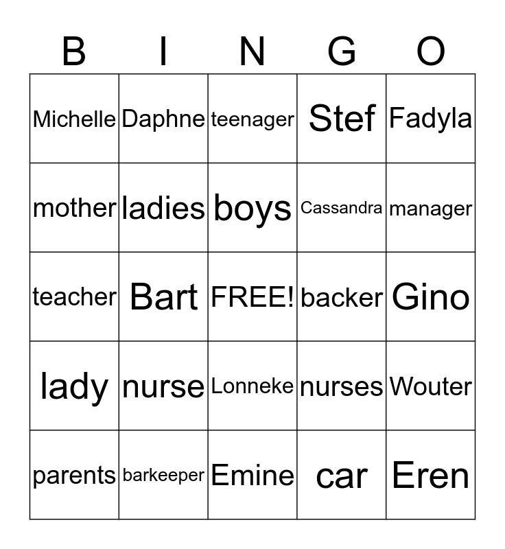 This bingo card has a free space and 34 words: children, car, girl, girls, lady, ladies, Fadyla, parents, Daphne, boy, boys, teenager, woman, women, backer, manager, barkeeper, teacher, nurse, nurses, Lonneke, Delano, Michelle, Gino, Emine, Eren, Stef, Noa, Cassandra, mother, father, Bart, Wouter and Zoë.