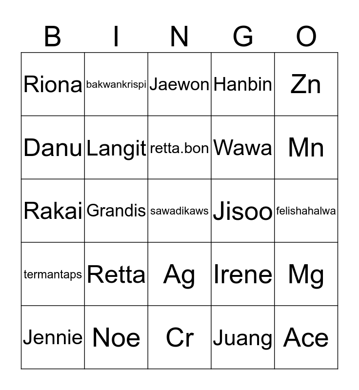 This bingo card has a free space and 24 words: Retta, Noe, retta.bon, Jennie, Zn, Riona, Danu, bakwankrispi, Jisoo, Ag, Wawa, Rakai, Irene, Mg, Langit, Juang, felishahalwa, Jaewon, Mn, Grandis, Ace, termantaps, Hanbin and Cr.