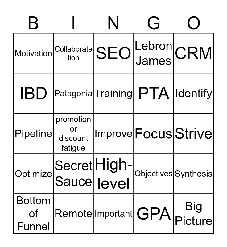 This bingo card has 40 words: Competitor, Pipeline, Funnel (not top or bottom), Patagonia, Remote, High-level, Training, Context, CRM, Optimize, promotion or discount fatigue, Lebron James, Improve, Strive, Focus, Secret Sauce, Kool Aid, Motivation, Client, SEO, Synthesis, GPA, PTA, IBD, Low hanging fruit, Top of Funnel, Move the needle, Awesome, Big Picture, Strategy Strategic, Campaign, Bottom of Funnel, Work-flow, Objectives, Identify, Important, Convert Conversion, Opportunity, Collaborate tion and Goal/s.